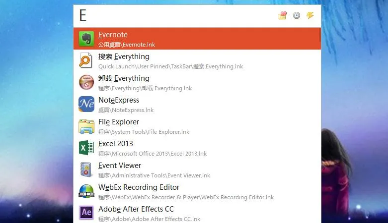 默认Windows+G,调出对话框,只需输入字母就能轻调用文件和软件,支持用拼音缩写来匹配(比如我只输入一个E,界面如下图),这时双击即可,能极大地提高用户的操作速度和效率,再也不用到开始菜单中去找了!