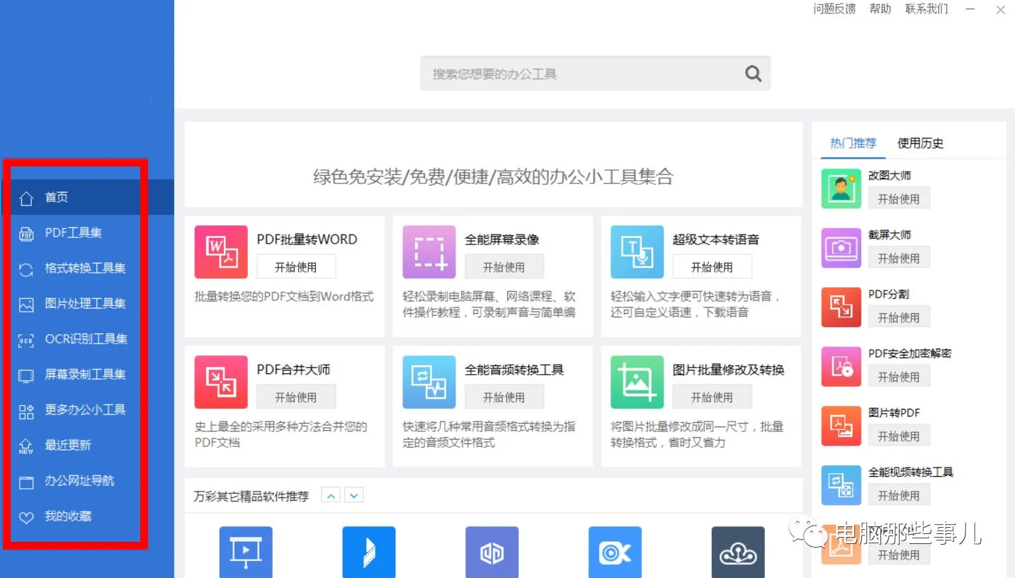 在日常的学习或者工作中我们经常需要用到很多操作,比如说PDF转Word,图片去水印,音、视频格式转换、录屏等等。在通常情况下,我们完成这些工作需要安装非常多的软件,会占用很多的电脑空间,而且操作起来不太方便。今天,“电脑那些事儿”要给大家介绍一款电脑软的办公神器,集合了上百种功能,让你爱不释手!