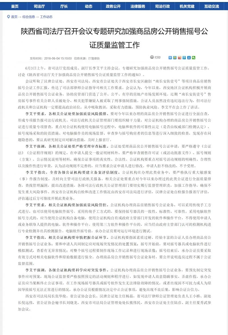 6月3日上午,陕西省司法厅召开专题会议,研究加强商品房公开销售摇号公证质量监管工作,会议听取了汉唐公证处、西安市司法局、西安市公证处关于西安的“摇号门”事件的公证工作汇报,传达了司法部律师公证指导司相关工作要求。