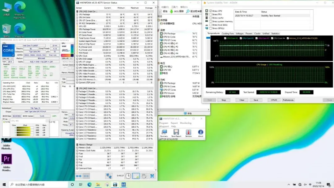 在满载状态下,CPU温度最高81℃,稳定在73℃,功耗19W,频率3.8~3.9GHz。