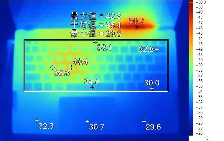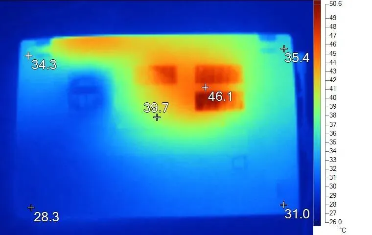 表面温度如上图所示,键盘键帽温度最高为40.4℃,WASD键位区域在39℃附近,方向键30℃。左腕托温度为32.3℃。背面最高温度约46.1℃,中心点温度39.7℃。