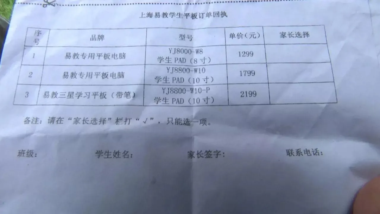 学校给家长们发了一张单子,上面公布了一个品牌三种平板电脑的价格,从1200多元到2100多元不等 ,对于家中已有平板电脑的,必须支付500元的软件使用费。