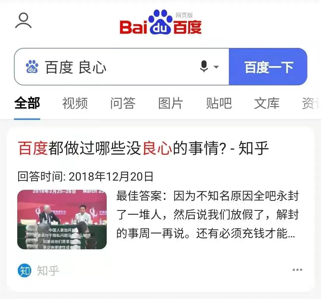 所以,人们很难把“百度”和“良心”挂钩,百度搜索“百度 良心”,第一个结果是知乎的问答“百度都做过哪些没良心的事情”。还好,百度能清醒地认识到自己的不足,没有屏蔽这个问答。