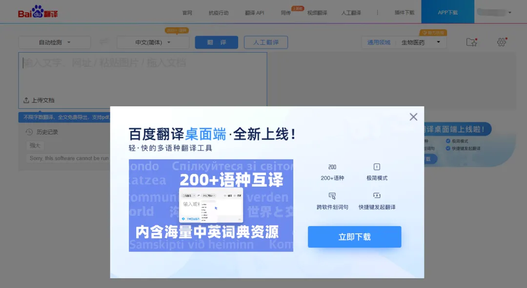 虽说百度翻译APP都已经推出了8.0版本了,但桌面版确实是第一次发布,并且支持Windows和macOS两大系统。百度翻译桌面版是没有独立官网,而是在百度翻译网页界面里边,可以直接下载。