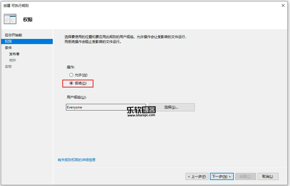 3,我们要限定EXE程序,只需右键新建可执行规则,在权限中选择拒绝,即拉入黑名单。其中指定用户组为Everyone,则意味着所有此电脑上所有登录用户都将受到此限制,当然你也可以选择指定特定的用户。