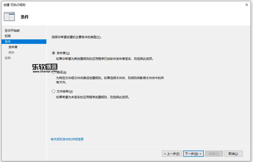 规则条件一共提供了三种方式,证书的发布者、文件路径以及文件哈希。