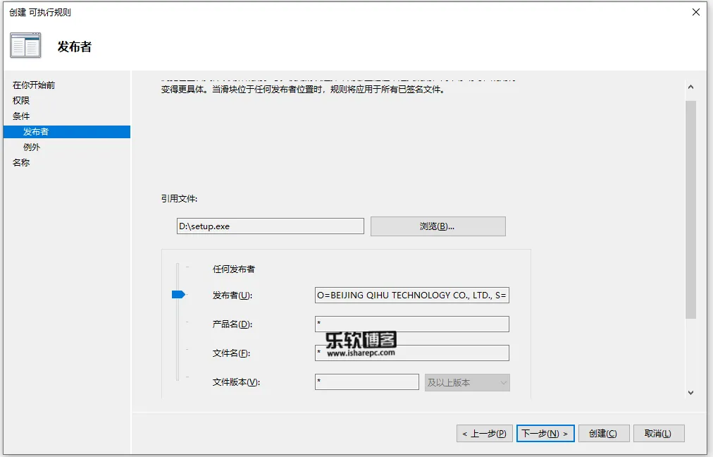 比如你要禁止360系列的软件,可以随便下载一个360安装包,导入选择后,拖动滑块指向发布者。