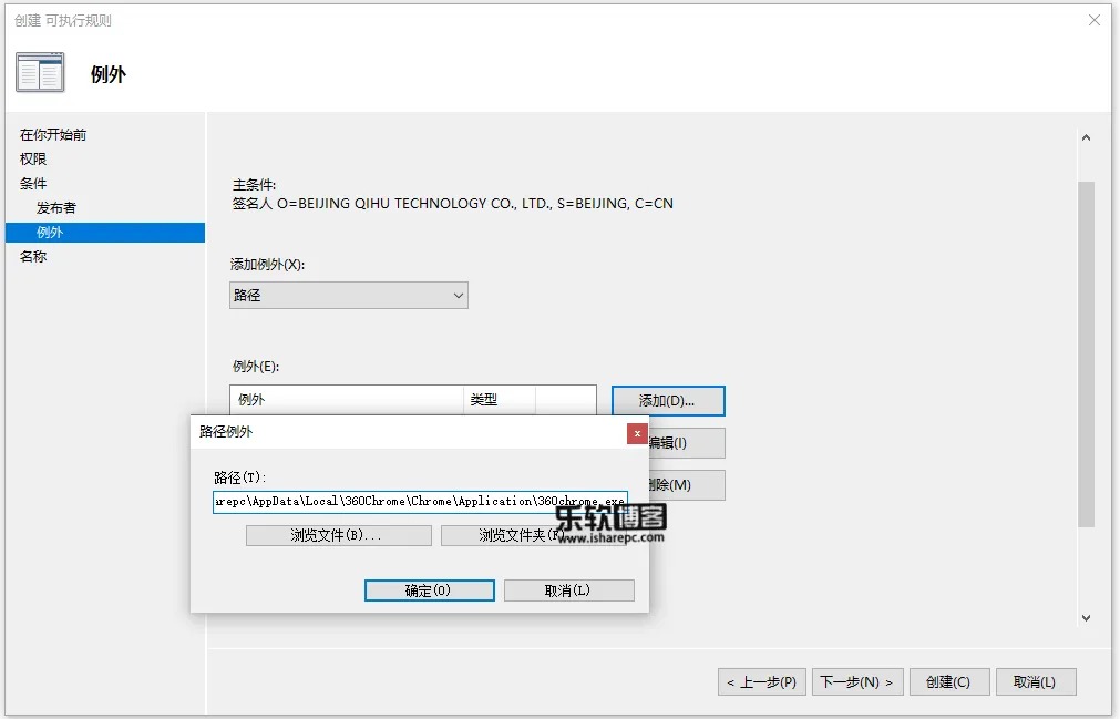 此外还可以设置规则例外,这一点非常有用,因为一旦选择了基于发布者创建规则,所有同一个发布者的软件(包括已安装好的)都不能正常运行了,实际情况我们可要用其中的某个软件,比如很多人喜欢360浏览器,这时就可以通过它来做个排除,最方便的就是直接指定程序路径~
