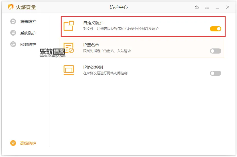 首先火绒默认是关闭了自定义规则功能,你需要在防护中心打开高级防护。
