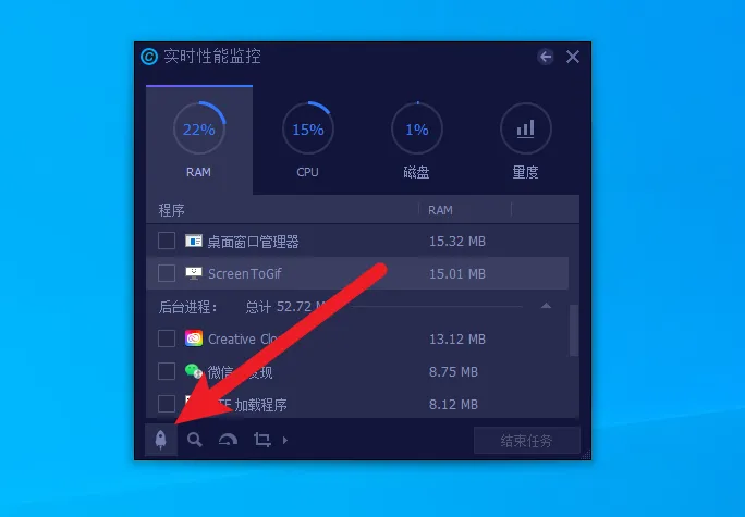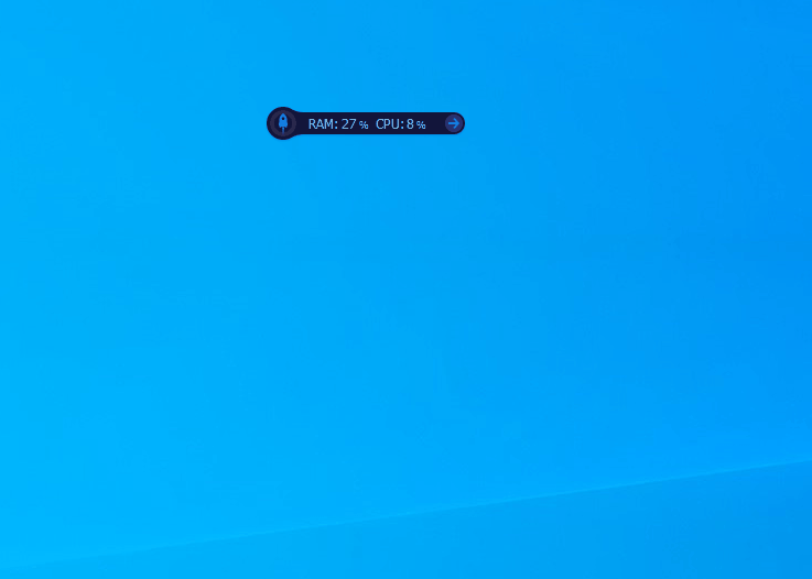 默认状态下是一个小长条,只显示内存和CPU占用情况,如果要查看更加详细的数据,直接点击向右的小箭头即可展开详细视图