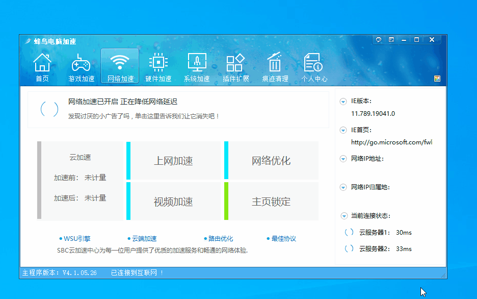 比如网络加速,点击一下就能调用蜂鸟提供的网络加速服务,提高网页打开速度