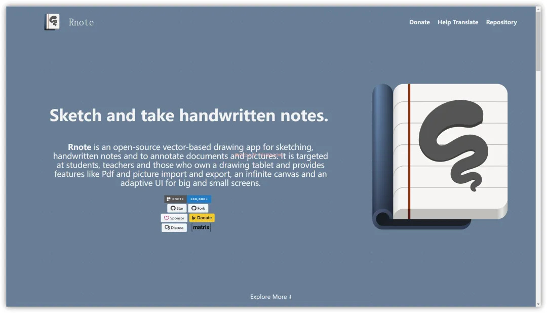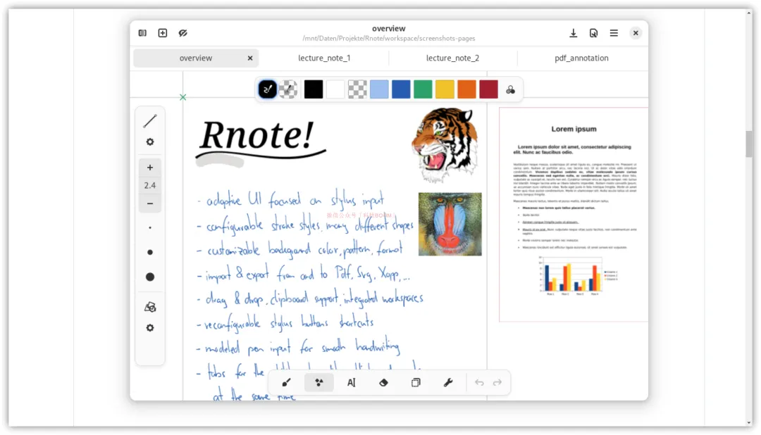 Rnote 是来自 Github 的一款基于矢量的免费、开源、无广告的绘图应用程序,可用来绘制草图、手写笔记以及注释文档和图片等等。它简单好用,支持 Windows、MacOS、Linux 等主流的操作系统。