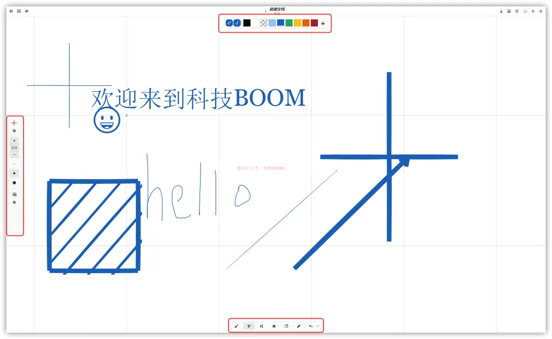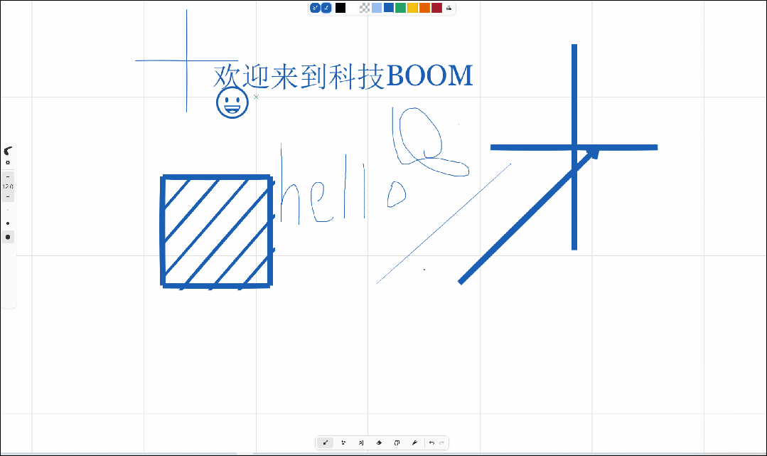 它的工具栏分布在页面的下方和左侧,左侧的相当于下方工具栏的「二级菜单」,会跟随下方工具栏选中的功能发生变化。页面上方则可以改变画笔、形状、文字等等的颜色: