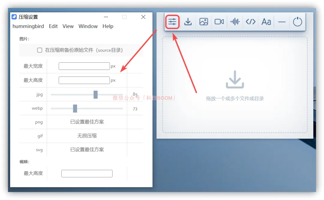 打开软件后,点击工具栏最左侧的设置按钮可以自定义它的图片、视频压缩功能,支持压缩 JPG、PNG、Webp、SVG、GIF、MP4、MOV 等格式: