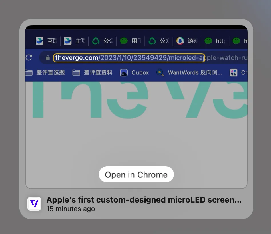 如果这条内容来自于 Chrome 、 Safari 这些常用浏览器,你还可以点击 Open in Chrome ,直接打开那个网页,成功穿越回去。