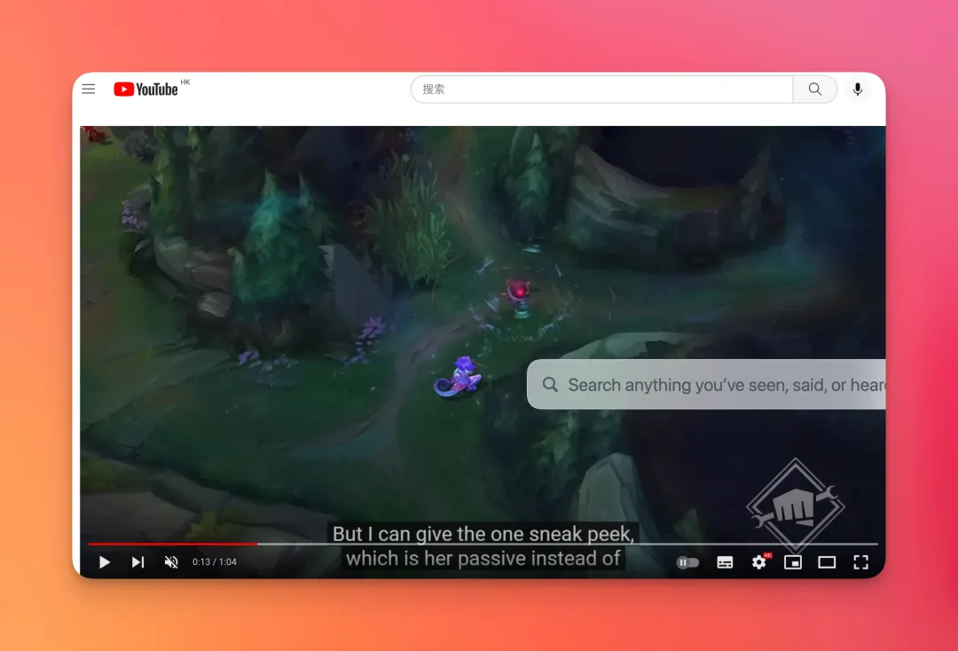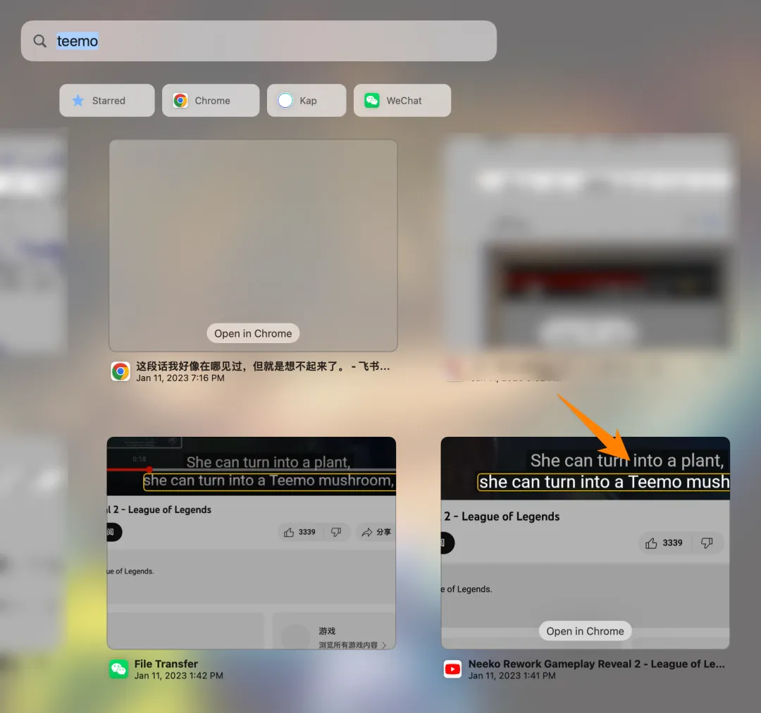 比如输入 teemo ( 提莫 ),结果找到了前几天看过的一条 LOL 视频,因为当中一段字幕里曾出现过 teemo 。。。