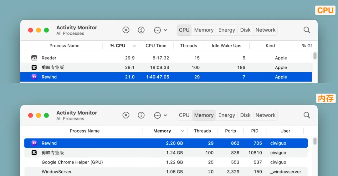 Rewind 21% 的占比,对于 8 核 M1 的 CPU 占比大概是 2-3% 。