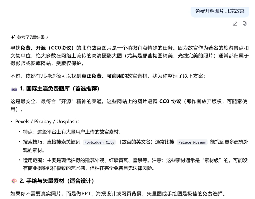 传统搜索的痛点的莫过于“答非所问”和“广告轰炸”,比如想找免费开源图片,结果满屏都是挂着“开源”幌子的推广。但夸克深度推理模式完全不同,它能精准捕捉用户深层需求,全程无废话、无中间商,直接给到核心结果。搜开源图片就推送纯免费的正规网站,找资料就直达关键信息,省去筛选无效内容的时间,效率直接拉满。