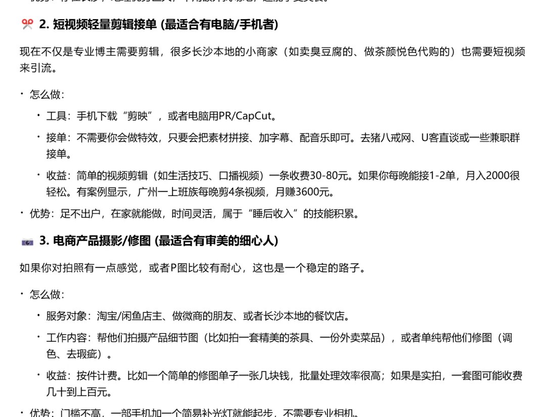 面对复杂又私人的需求,夸克的深度推理能力堪称“私人顾问”。比如有30岁新媒体人提问:“每天晚上8点后有空,想做能增收的有价值工作,月入2000即可,求5个详细方法”,夸克会结合“新媒体技能”“碎片化时间”“增收目标”三个点,给出可落地的操作步骤,从内容变现到技能接单,每一个方案都贴合提问者的现状,完全不是泛泛而谈的模板化答案。