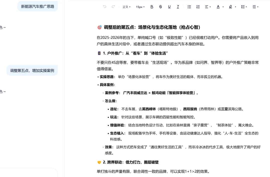 很多人用AI生成PPT、文章时,总遇到“看着还行但不能用”的问题,夸克却把“定制化”做到了极致。想做“新能源汽车推广思路”PPT?打开深度推理模式,它会整合全网有效信息,支持多人追问迭代——觉得第五点没吸引力,直接说“调整第五点,增加实操案例”;如果还是觉得逻辑不顺畅,随口提一句“优化结构,按用户决策路径排序”,经过几轮互动,输出的内容就能完美契合需求,复制到PPT里直接能用。