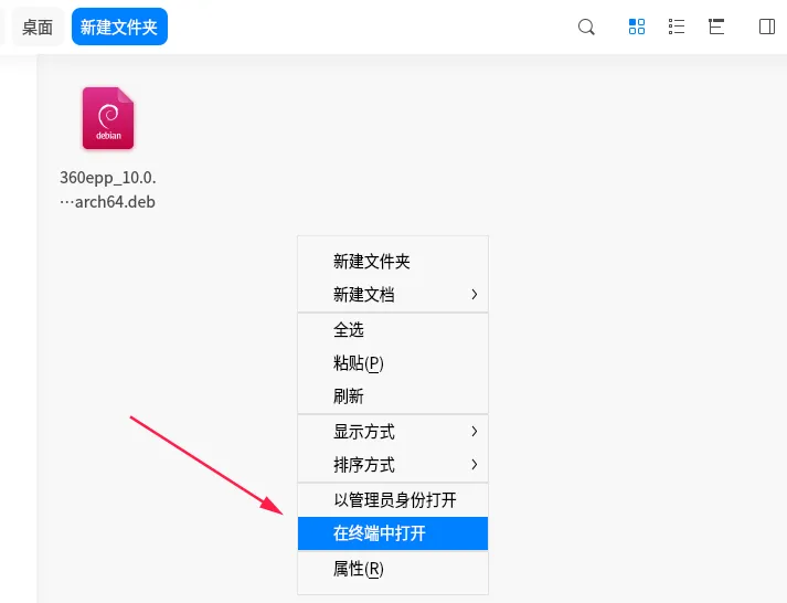 假设你下载了360杀毒的安装包,包名为:“360epp_10.0.0.2316_uos_desktop_loongarch64”,那么可以在安装包附近的空白处鼠标右击-打开终端,输入: