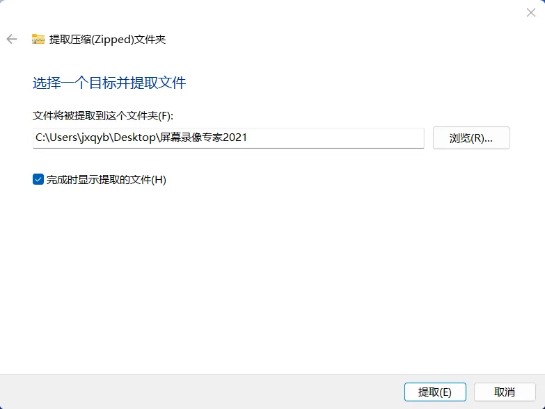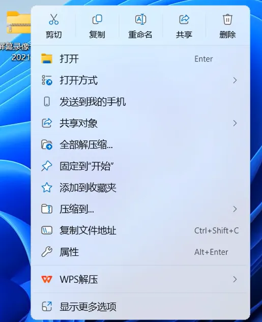 2.1,鼠标右击【屏幕录像专家2021】压缩包(Win11系统需先点击“显示更多选项”)选择【全部解压缩】。如下图: