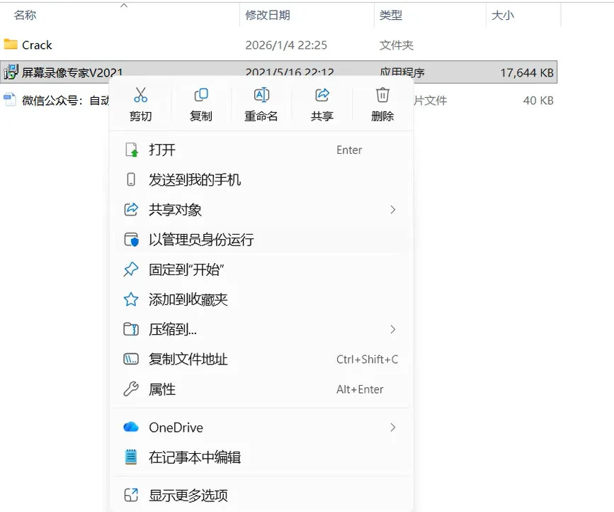 2.3,打开解压后的文件夹,双击打开【屏幕录像专家2021】->【屏幕录像专家2021】文件夹。2.4,鼠标右击【屏幕录像专家V2021】选择【以管理员身份运行】。