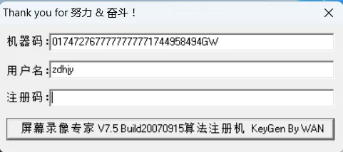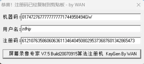 2.23,将注册中的机器码复制到机器码中,用户名填写为【自动化家园拼音首字母zdhjy】,然后点击【屏幕录像专家V7.5】。