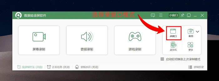 第一步:屏幕录制电脑怎么操作?启动软件后,在初始界面选定所需的录制模式(下文将以窗口录制模式为例进行说明);