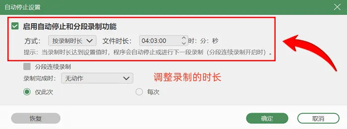 第二步:进入录制前的调试界面,用户可根据自身需求自由选择录制范围与音频参数,若有特殊需求,可点击下面【按时长录制】按钮调整录制时长;所有参数设置完成后,点击【开始录制】即可;