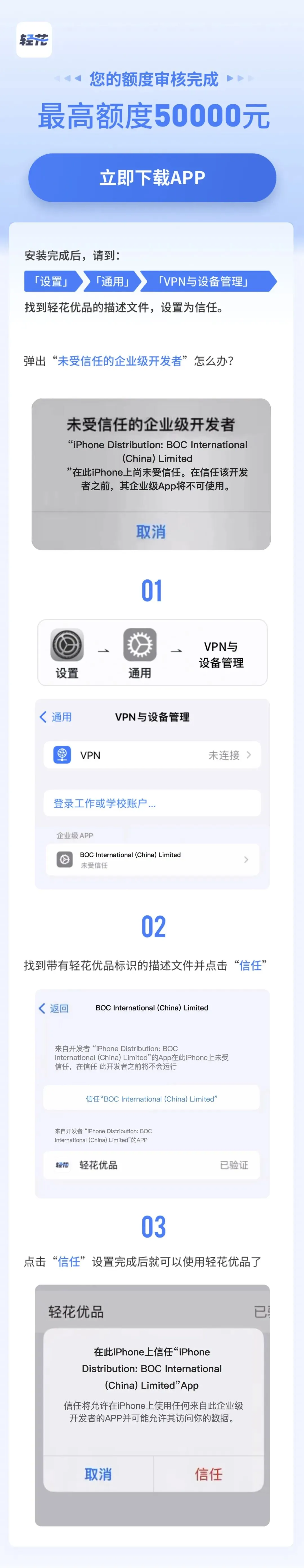 先把手机里那个老版本APP彻底删干净,再按我教的新法子重新下载安装。注意哈,不是换手机号!就用你现在的号码,找另一台手机登上去看看,有时这样就能解决问题!要是这两招都不管用,试试开关手机数据网络(关了再开,或者换移动数据/Wi-Fi切换)。再不行的话,八成是平台那边出毛病了,只能等他们自己修好。这网站有正规企业备案,是我专门挑的贷款超市软件,放心点进去。为啥别用微信开?我们测试过,微信点它只会跳百度!所以 必须按红字提示,用手机自带浏览器开!打开“推推用”网站后,直接在搜索框输入 “轻花优品” ,搜一下。会跳出 两个结果 ,都是官方正版入口,随便点哪个都行!关键提醒! “轻花优品”的链接已经红了(意思是被微信等封了),所以 千万!别在微信、QQ或它们自带的浏览器里点!一定要用你手机自带的浏览器开!点下载时,可能弹出提示说 “Safari浏览器打不开网页,网址无效” 。别理它!就在那个页面,对着 《立即下载APP》 按钮, 猛戳几次!多按几下! 按着按着,安装界面就蹦出来了,跟着提示操作。装完后别忘了:进手机 【设置】 -> 【通用】 -> 找到 【VPN与设备管理】 (或类似名称),在里面选信任项, 点一下信任 这个APP,搞定!最后千万记牢: 这个公众号是我们专门搞退息(退利息)信息的, 不是“轻花优品”的官方号! 所有让你提前交钱、押金、手续费的,都别信!捂紧钱包,防上当!