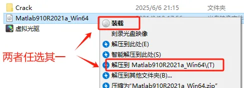 第三步:打开解压后的文件夹,选中【Matlab910R2021a_Win64.iso】右击,选择装载或解压。