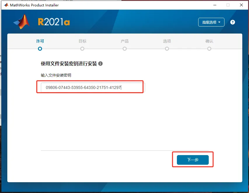 第六步:复制以下标红秘钥并粘贴输入【09806-07443-53955-64350-21751-41297】,点击【下一步】。