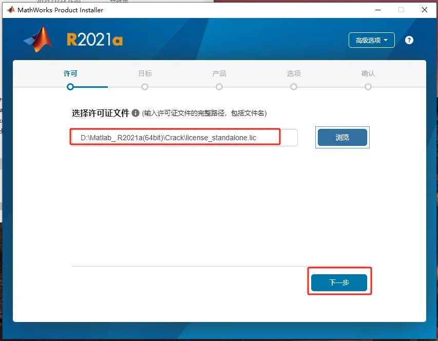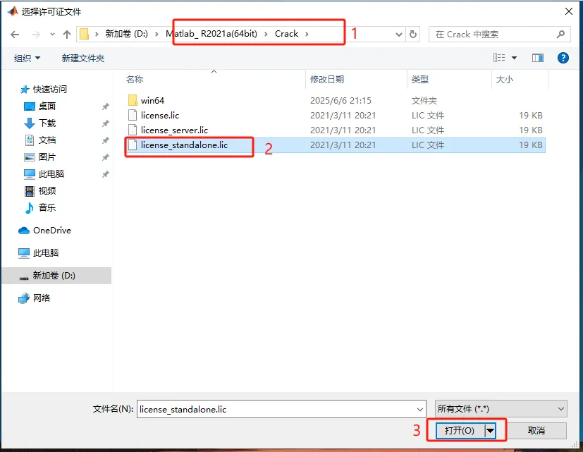 第八步:选择安装包解压后的【MATLAB_R2021a(64bit)】文件夹中【Crack】文件夹下的【license_standalone.lic】文件,点击【打开】。