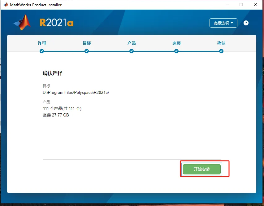 第十三步:点【开始安装】。注意安装位置一定要保留足够的安装空间。