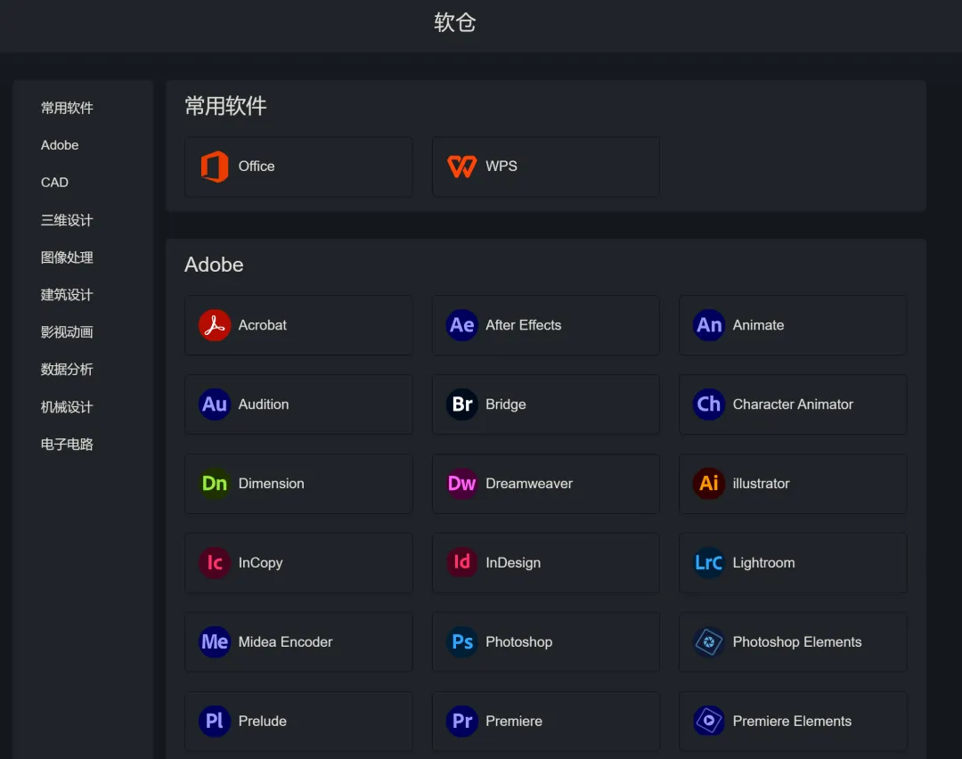 软仓是一个专注于提供各类软件下载的网站,涵盖了从办公软件到专业设计软件,从数据分析工具到影视动画制作软件的广泛类别。无论是学生党需要的 Office 套件,还是设计师必备的 Adobe 系列软件,亦或是工程师需要的 CAD 软件,这里都能找到。