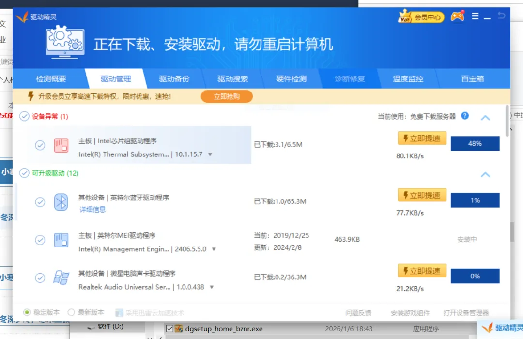 我平时装完系统喜欢用驱动精灵来安装驱动,它把安装系统驱动检测方面啥的没问题,但是,就是下载驱动程序那个网速慢的比蜗牛还慢。