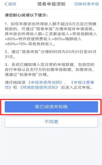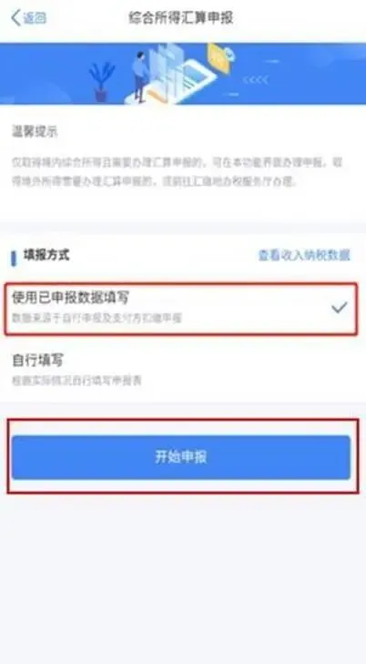 | 准备申报。打开个人所得税 APP,可从以下入口进入年度汇算: 首页【常用业务】—【综合所得年度汇算】;首页【我要办税】—“税费申报”【综合所得年度汇算】。 进入申报界面后,填报方式有【使用已申报数据填写】和【自行填写】两种选择。为方便您申报,推荐选择【使用已申报数据填写】,税务机关已按一定规则预填了部分申报数据,您只需确认即可。选择【使用已申报数据填写】—【开始申报】后,系统提示【标准申报须知(使用已申报数据)】,点击“我已阅读并知晓”,开始年度汇算申报。 |