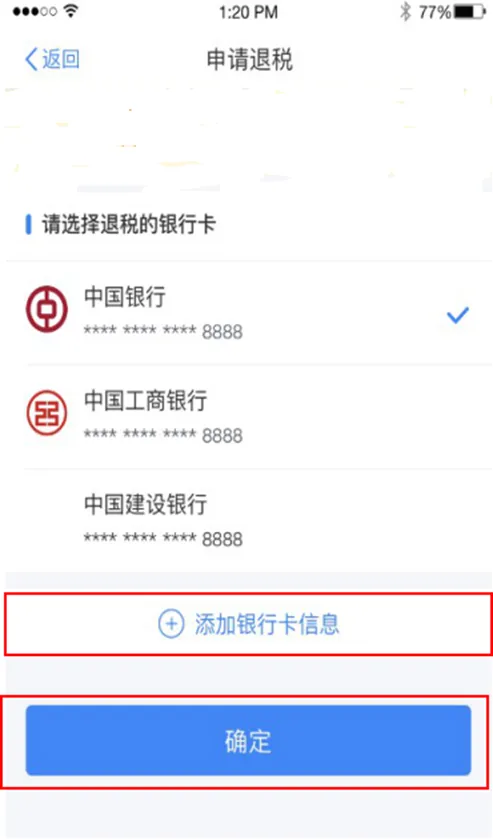 | 退(补)税。如存在多预缴税款,可选择【申请退税】。 点击【申请退税】后,纳税人需选择退税银行卡。如前期已添加过银行卡,系统将自动带出已填银行卡信息。您需新增,点击【添加银行卡信息】—【确定】。 如您汇缴需要补税,且不满足豁免条件,可点击【立即缴税】,选择相应的缴税方式完成支付即可。 如您综合所得年度汇算需要补税但满足免予汇算条件,则在税款计算后,申报界面直接点击【享受免申报】即可,无需缴纳税款。 |
