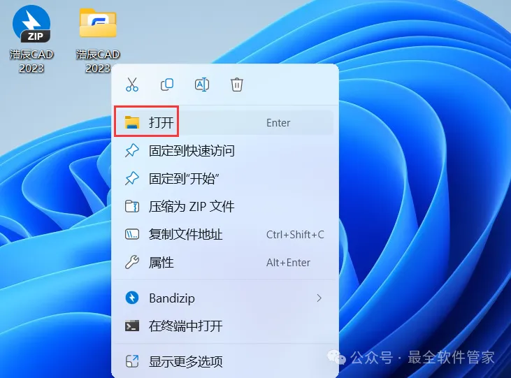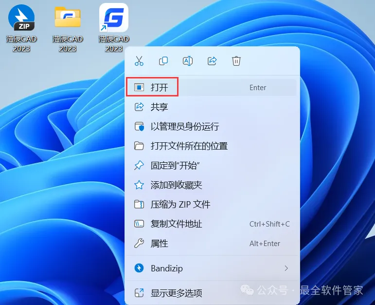 13、回到桌面,右键桌面上的【浩辰CAD 2023软件图标】,点击【打开】;注意:软件打开显示试用30天,实际可以无限制循环使用