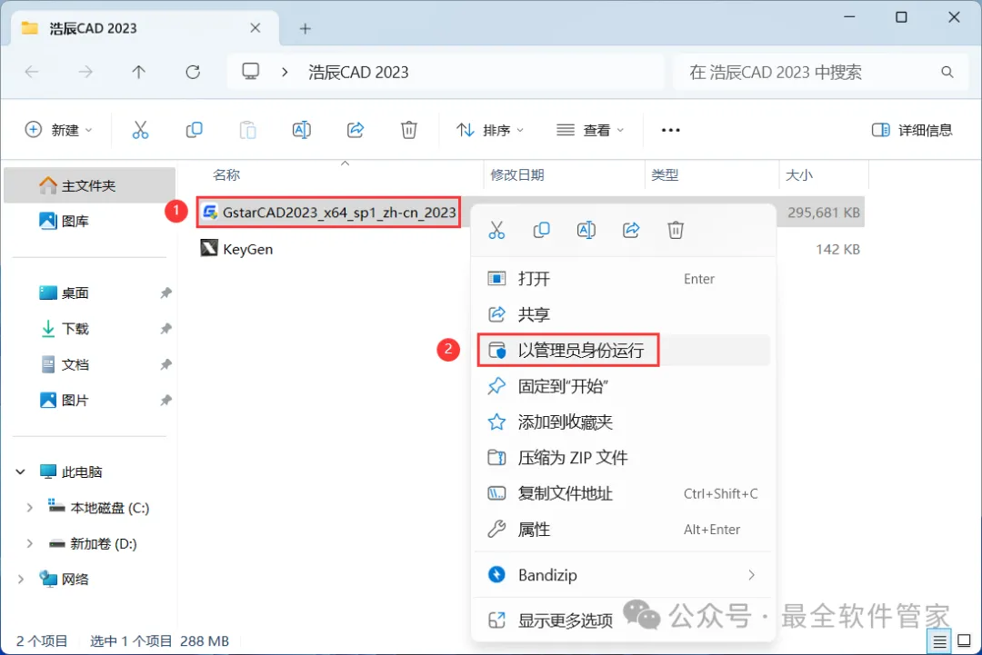 9、回到浩辰CAD 2023文件夹,找到【KeyGen】应用程序,右键选择【以管理员身份运行】它