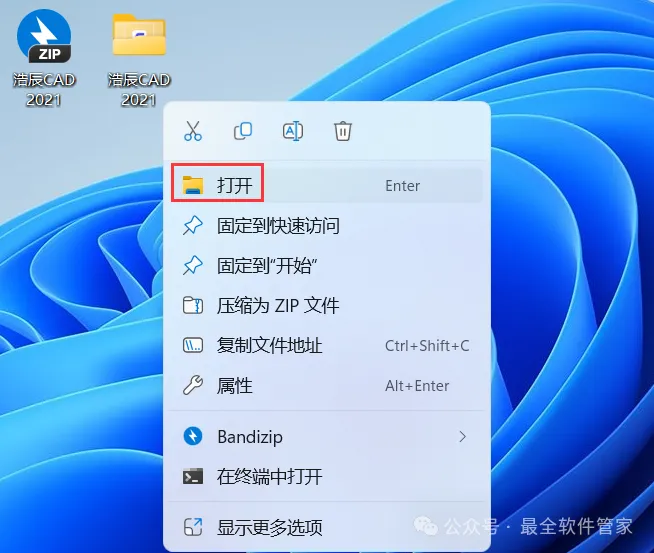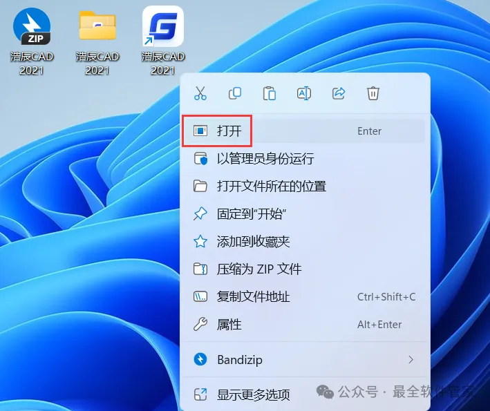 13、回到桌面,右键桌面上的【浩辰CAD 2021软件图标】,点击【打开】;注意:软件打开显示试用30天,实际可以无限制循环使用