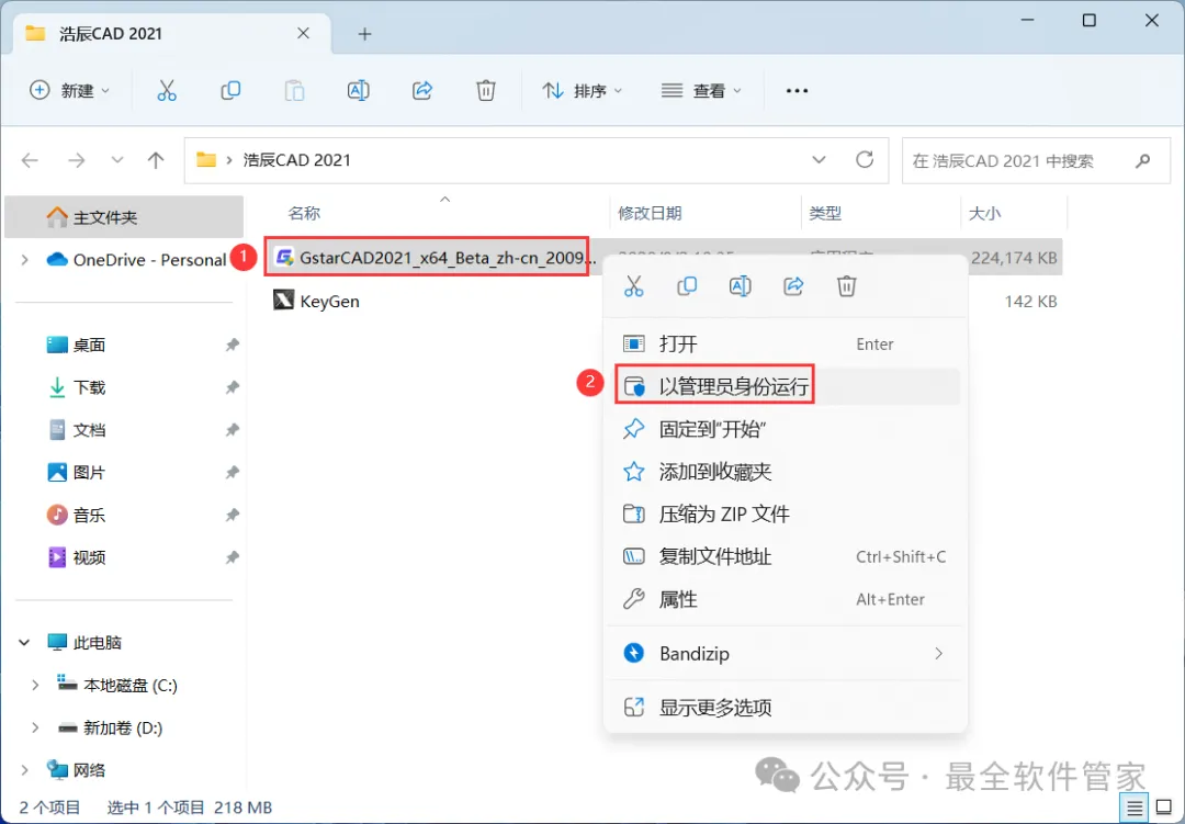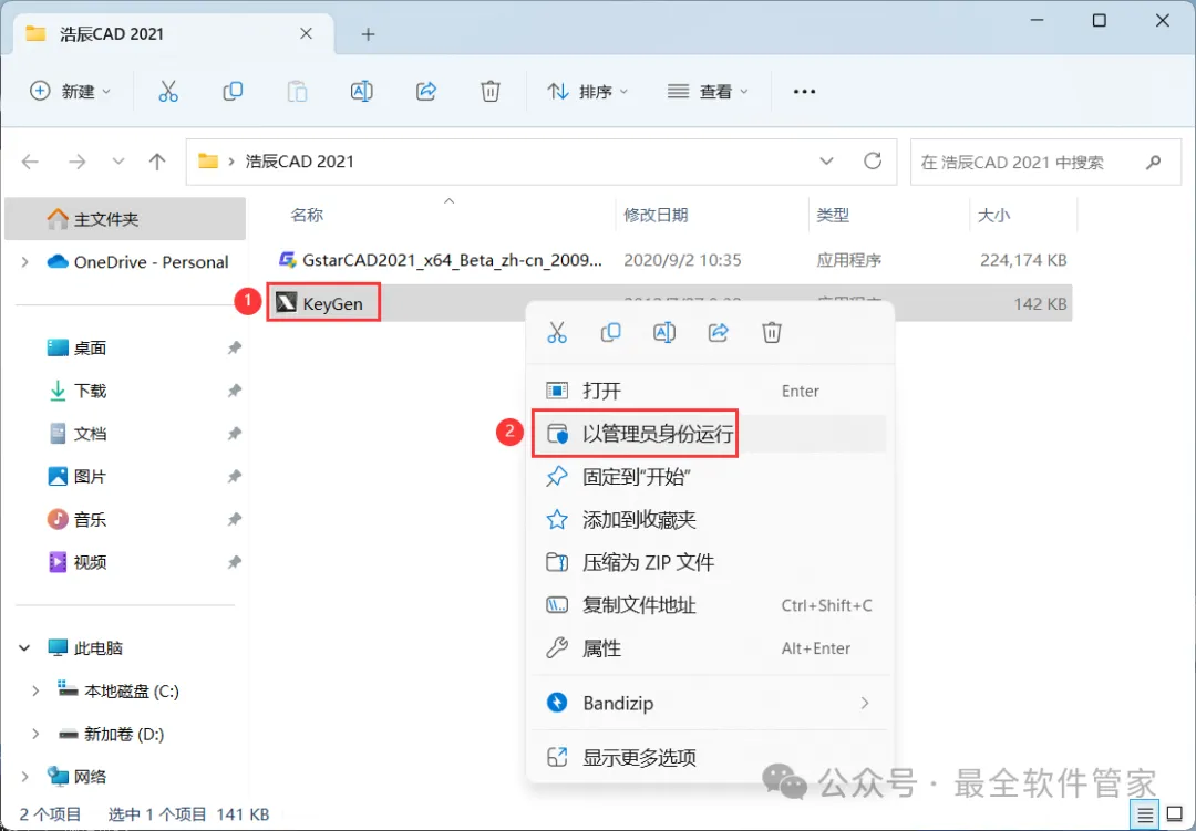 9、回到浩辰CAD 2021文件夹,找到【KeyGen】程序,右键选择【以管理员身份运行】它