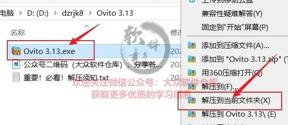 1.把资源从网盘下载到电脑上面,右键Ovito 3.13.exe压缩包选择解压到当前文件夹;
