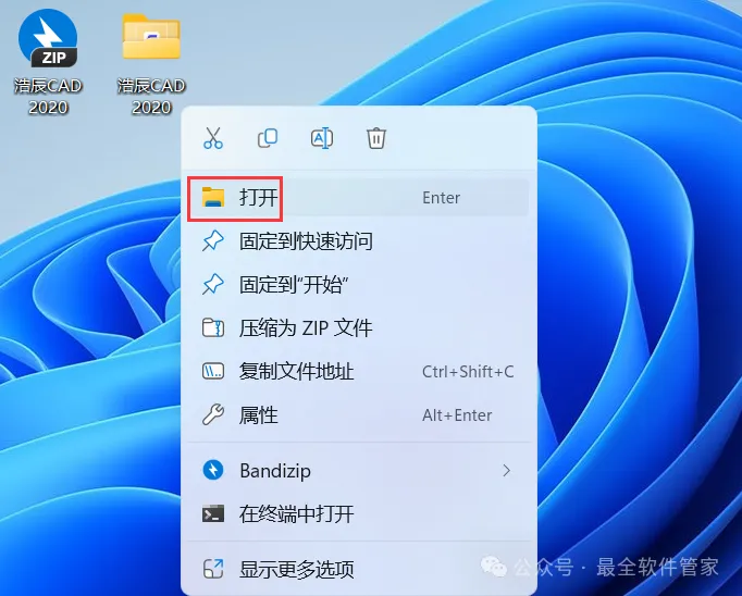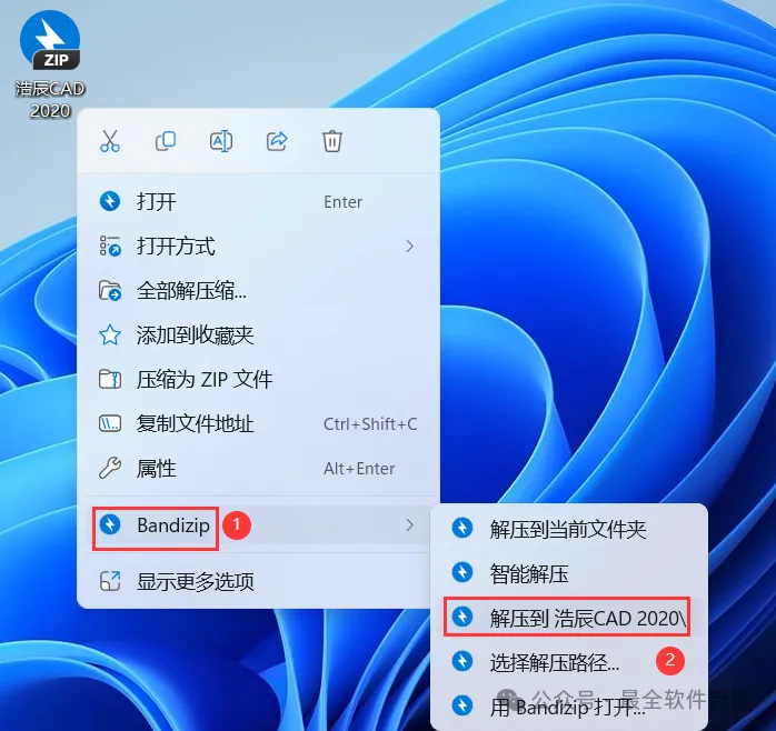 1、下载浩辰CAD 2020软件安装包到电脑上,右键选择【解压到浩辰CAD 2020\】