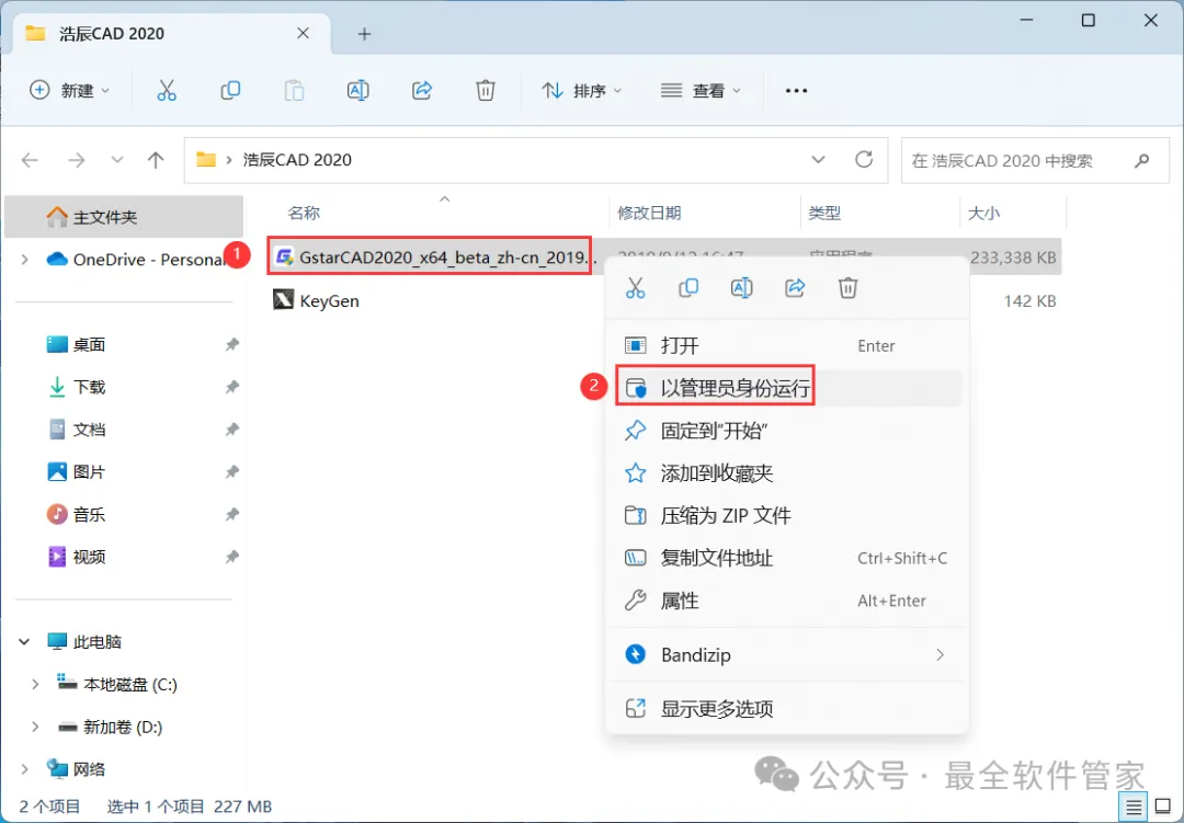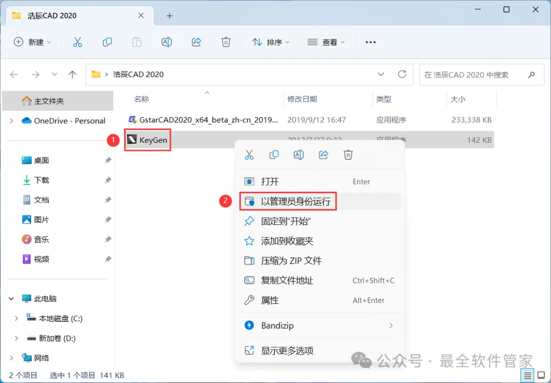 8、回到浩辰CAD 2020文件夹,找到【KeyGen】程序,右键选择【以管理员身份运行】它