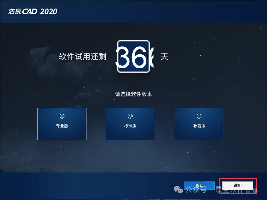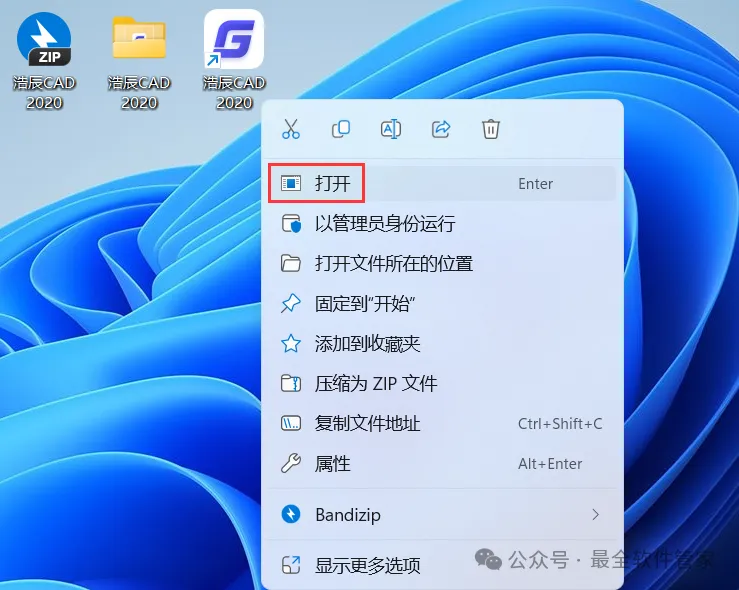12、回到桌面,右键桌面上的【浩辰CAD 2020软件图标】,点击【打开】;注意:软件打开显示试用366天,实际可以无限制循环使用