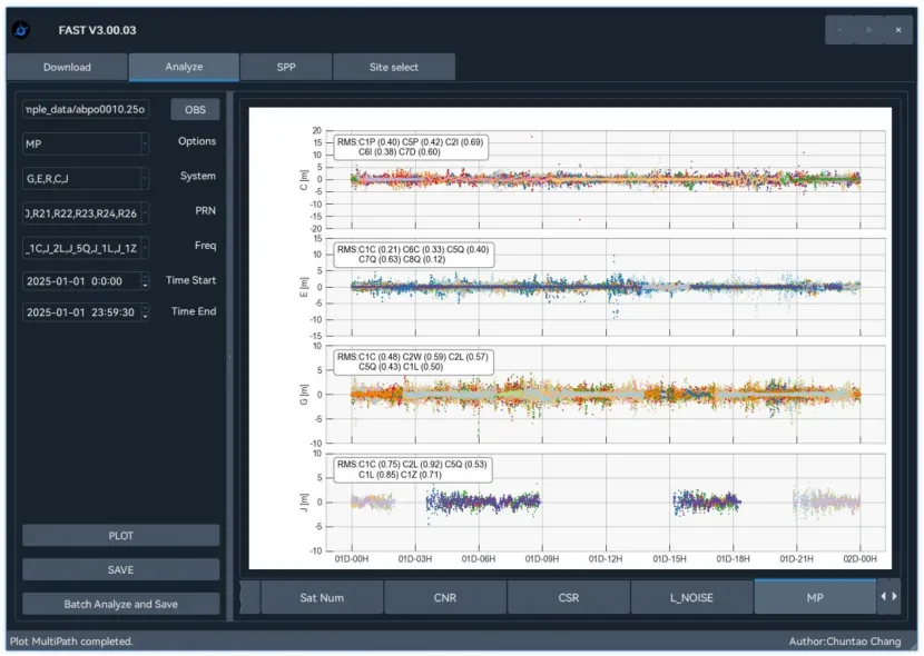 可对 GNSS 数据进行全面质量评估,支持多GNSS系统多频点的RINEX2.x/3.x的观测数据,用户只需输入文件,界面选择对应选项即可分析卫星观测数量、伪距与载波相位噪声、周跳比以及电离层延迟变化率等信息,软件进行交互式可视化分析。