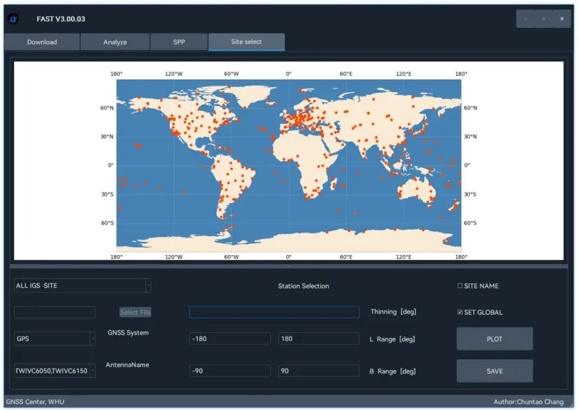 软件内置IGS站点信息,也可以自定义文件输入,可根据卫星系统、天线类型、地理范围及降采样设置进行站点筛选,支持多格式结果导出,界面直观,提升操作效率。