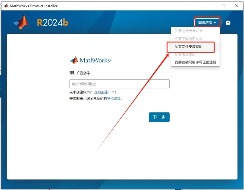 3. 点击右上角的“高级选项”,然后选择“我有文件安装密钥”。
